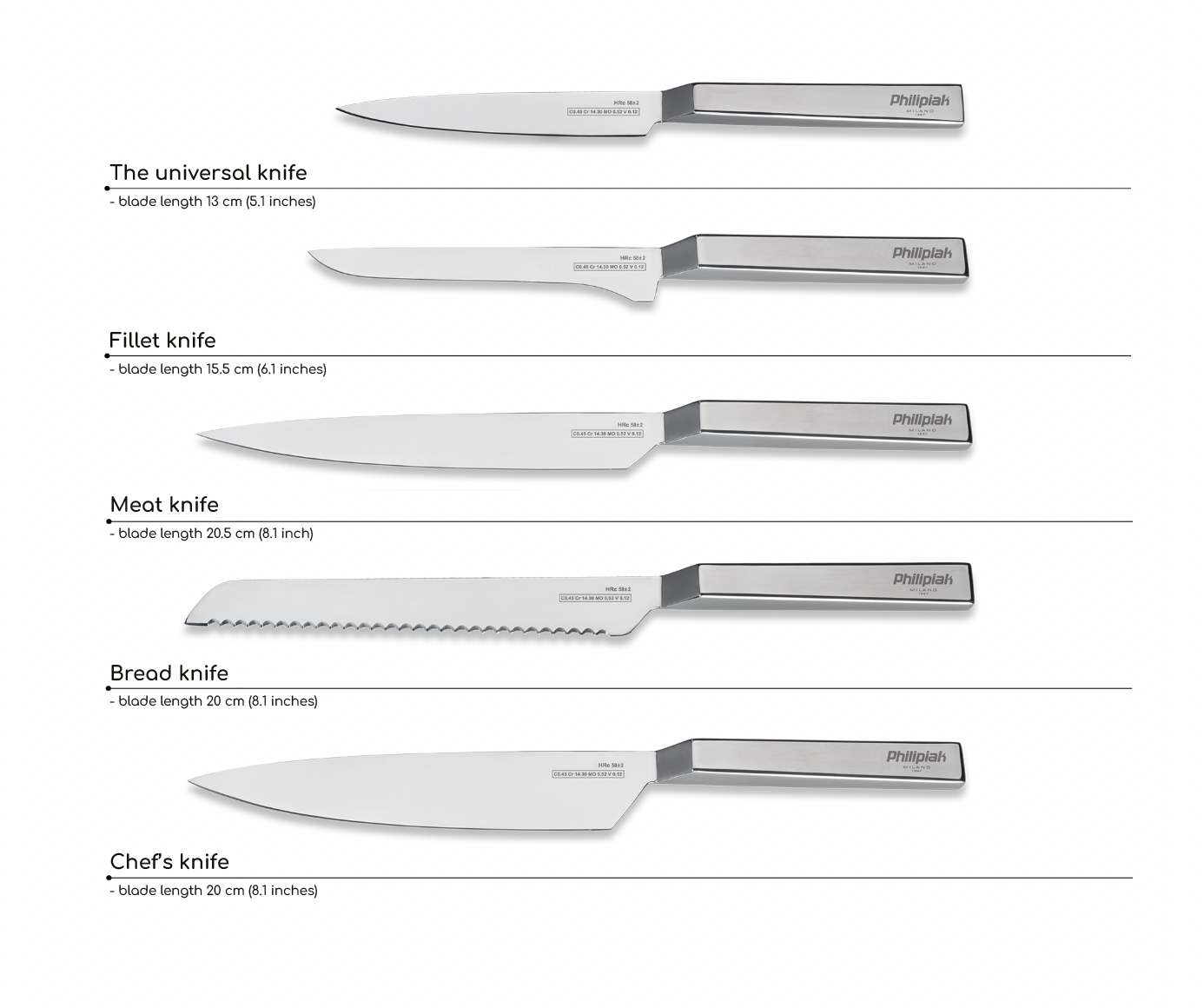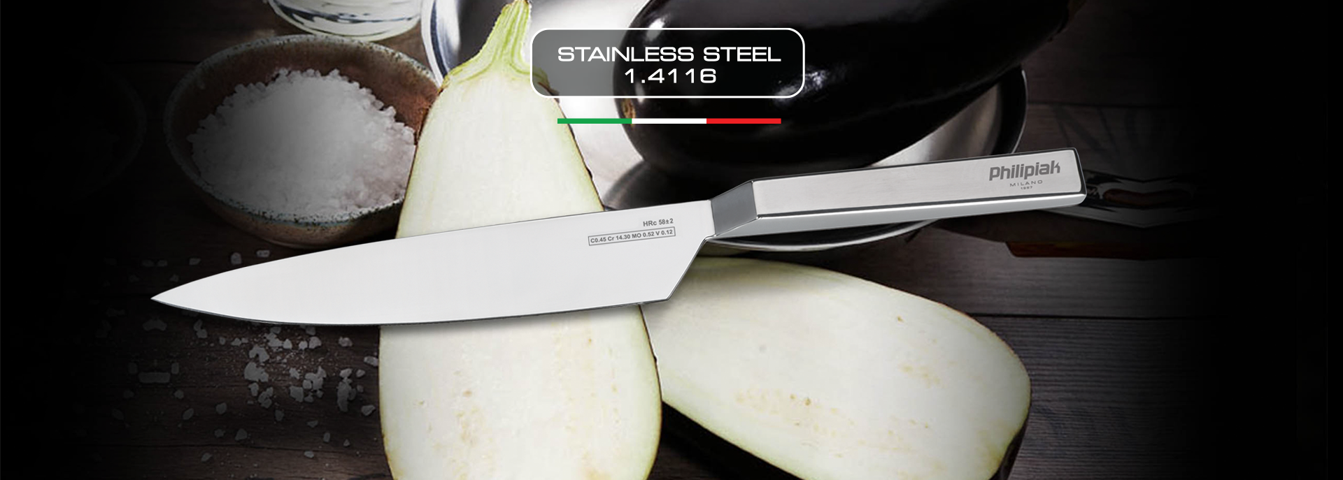 Recomendamos lavar los cuchillos de acero Philipiak Milano a mano. Aunque se pueden lavar en el lavavajillas, debido a los efectos de los productos químicos, este método de limpieza puede afectar negativamente a la apariencia de los cuchillos.